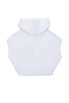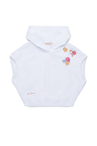 卵型のノースリーブフード付きスウェットシャツ。フロントにインスティテューショナル・ロゴとコントラストカラーの小花柄。コットン100%製。
