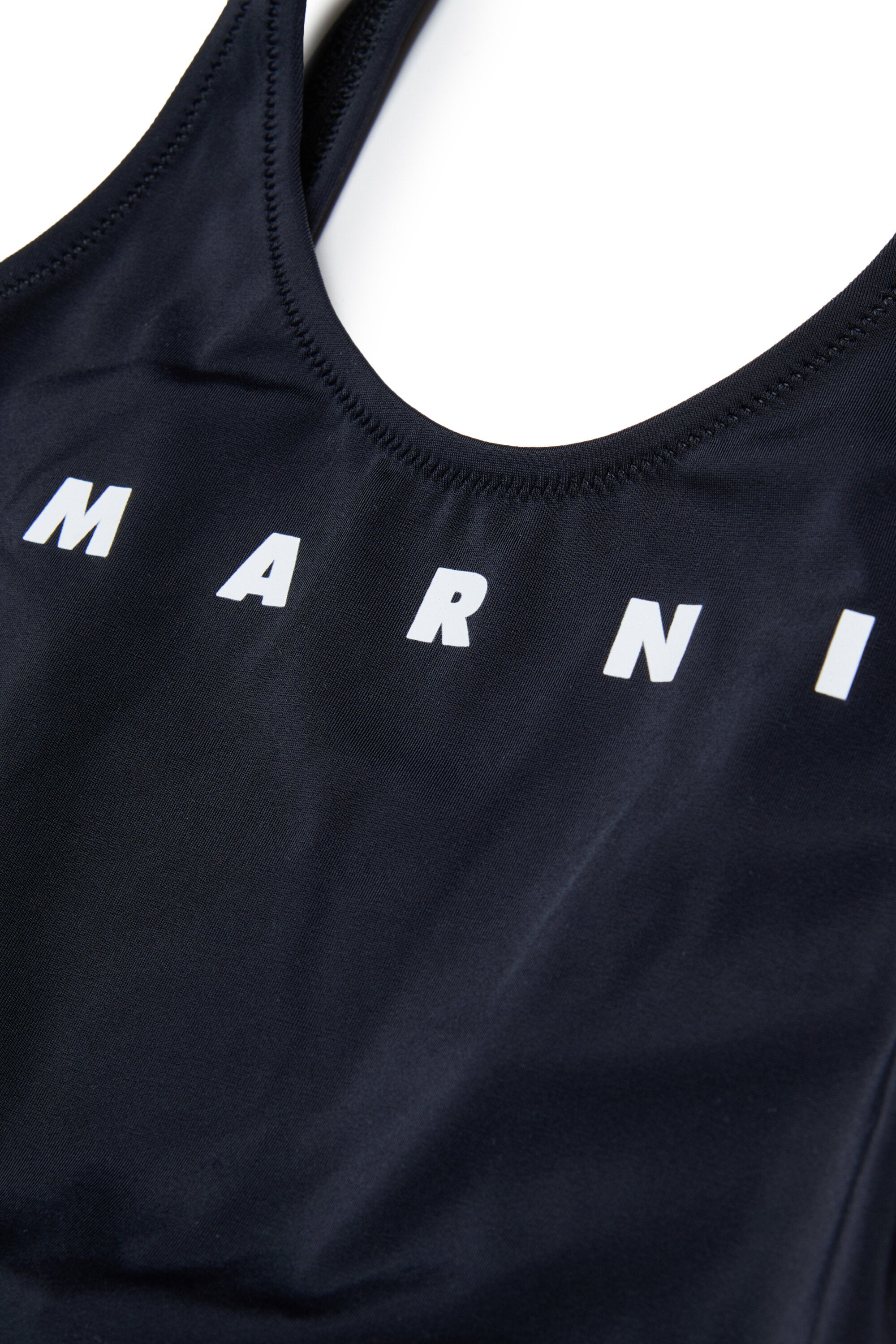 フロントにロゴが入ったワンピース水着。細いストラップと深いバックネックラインが特徴です。