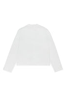 長袖クルーネックジャージーTシャツ。ややクロップド丈のフィット感で、ドロップショルダー。フロントにインスティテューショナルなロゴをあしらい、袖にはコントラストカラーの刺繍があしらわれています。綿100%で作られています。合わせやすいカジュアルなオプション。