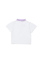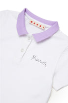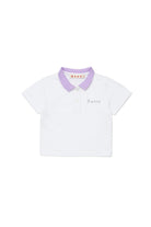 胸元に刺繍ロゴ入りの100%コットンポロシャツ、コントラストカラーの襟。