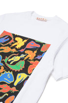 恐竜柄プリントを前面にあしらった、100%コットンのTシャツ。