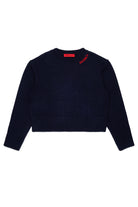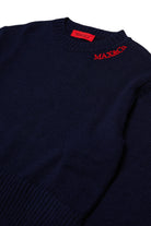 ウール混ニットの長袖ボクシー・プルオーバー。コントラストカラーの刺繍ロゴがネックとサイドのスリットにあしらわれ、モダンで分かりやすいルックス。カジュアルなデイリールックに最適。