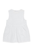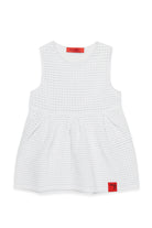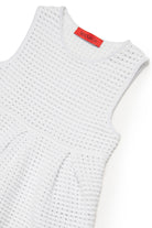 コットン混素材のクルーネックニットドレス。透かし編みのディテールと裾にあしらわれたロゴが特徴です。