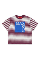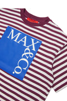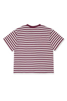 先染めコットン製のストライプ・マイクロリブの半袖Tシャツ。フロントにプリントされたロゴを引き立てるミックスカラー。