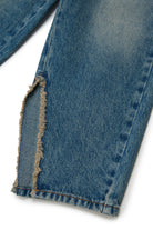 ミディアムブルーのレギュラージーンズは、裾の内側に生成りのスプリット入り。快適さと大胆なディテールが完璧に融合し、個性的で洗練されたルックに最適。