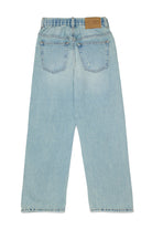 ライトデニムのレギュラージーンズ。軽いユーズド加工のアブレーションと脚部分に装飾パッチ付き。