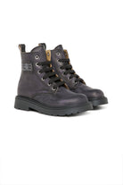 ハンドメイドのブリーチ加工を施したレザーコンバットブーツ。サイドにあしらわれた数字のロゴが、オーセンティックで現代的なタッチを加えている。