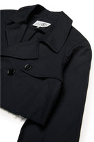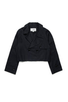 長袖ツイルジャケット。以前は構造化されていなかった2つのウェアを組み合わせたようなAカットつくり。フロントにウェルトポケット。フロントはダブルブレストクロージャー。裾はAカット。背中にアイコニックな縫い目。コットン100%製。MM6のDNAを体現する一着。