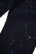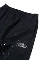 背面にアイコニックなステッチとロゴプリントをあしらったチノパンツ。スプレーペイント風のエフェクトがクリエイティブなアクセント。