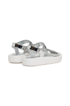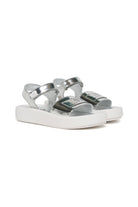 コントラストロゴ付きミラーエフェクトのメタリック仕上げサンダル。