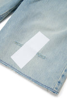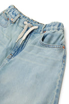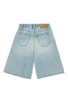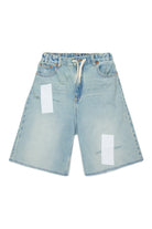 ウエストにドローストリングが付いたデニムショートパンツ、フロントにアプリケーションインサートあり。