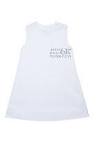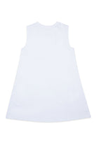 胸元にロゴプリントが施され、背面にはアイコニックなステッチが入ったノースリーブドレス。素材は100%コットンです。