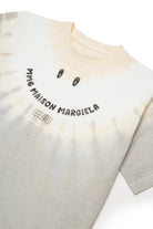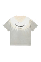 100%コットンのTシャツ。コントラストの効いたタイダイ柄とファニーなロゴが特徴です。フロントにはスマイリー風グラフィックプリントを配しています。