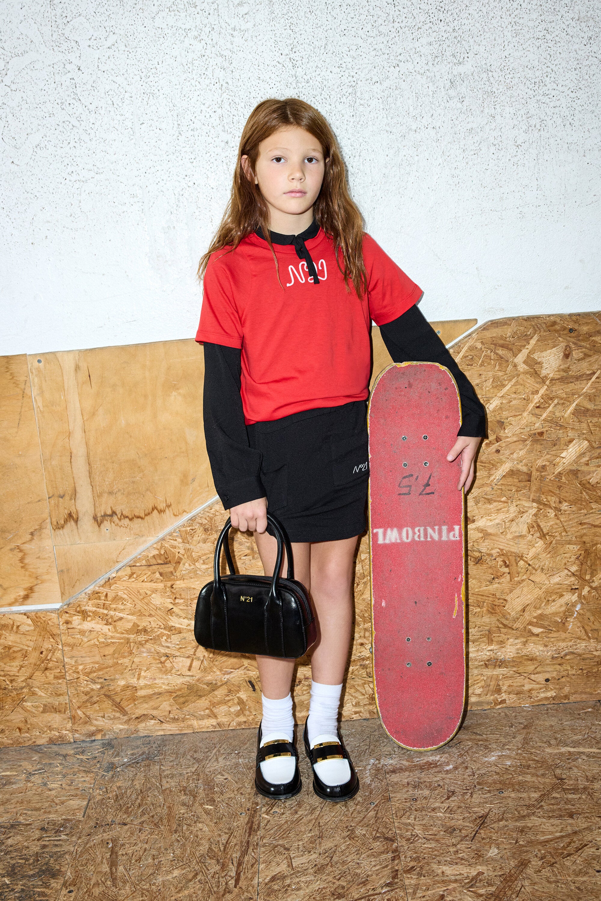 フロントにゴールドの「N°21」ロゴがあしらわれたハンマーコーティングのサッチェルバッグ。実用的で一目でN°21とわかるこのバッグは、デイリールックを完成させる理想的なアクセサリーです。