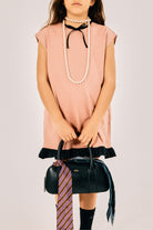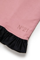 ロゴ入りショートドレス、裾にコントラストのあるフリルとネックにリボン付き