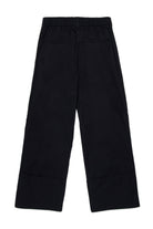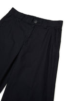 脚にロゴがあしらわれたパンツで、幅広の折り返し裾とテーラードディテールが特徴です。