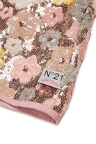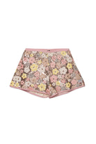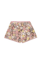 ロゴ入りショーツ、全体にフローラル効果のスパンコールで装飾され、鮮やかで個性的なスタイル。