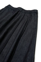 ウェッジ構造とフレアシルエットがモダンでダイナミックな印象を与える、ダークな生デニムのミディスカート。様々なシーンで活躍するこのスカートは、現代的なデザインで汎用性とスタイルを兼ね備えている。