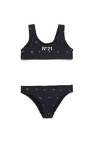 ショルダーストラップ付きライクラビキニ水着。オールオーバーの花柄プリント。フロントにN°21インスティテューショナルロゴ入り。 調節可能な 紐付き。