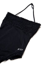 ロゴ入りワンピース水着、ネックラインと脚部分にギャザー入り。