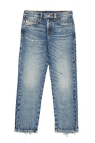 Five-pockets jeans with a straight fit and timeless attitude. Medium waist. Made of denim in a hybrid shade of blue and grey. Distinguished by gradients, whiskers and color contrasting seams. Mending abrasions and frayed hems on front pockets and hem. Features a contrasting color embroidered "D" logo on the back pocket. The design features an adjustable waist and elastic closure.