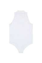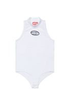 Sleeveless bodysuit with front logo and crew neckline, perfect for a minimal and modern style.