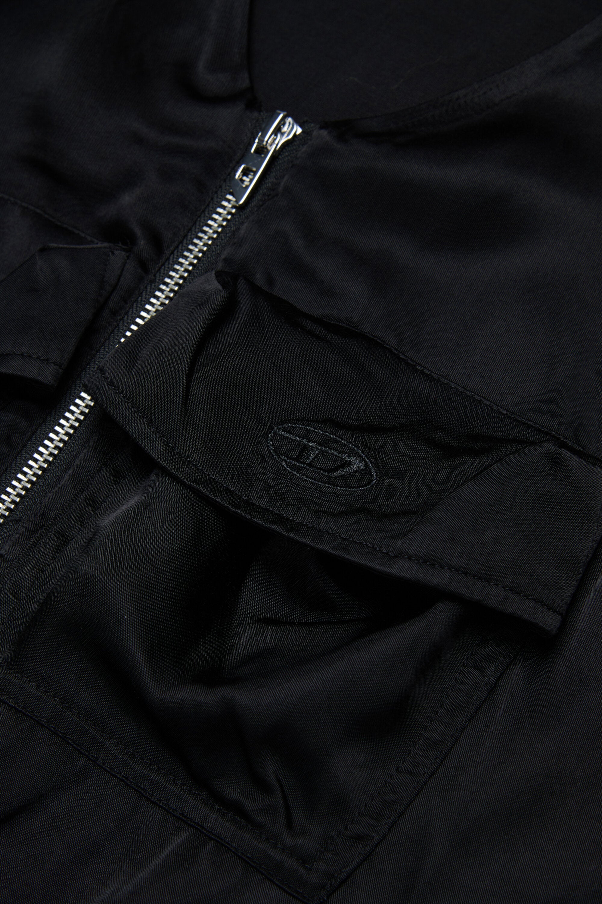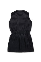 Short dress with logo and patch pockets. The model features a front zip closure, elasticated waist, and fabric with a satin finish.