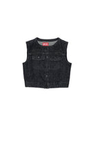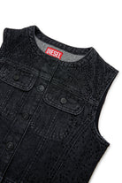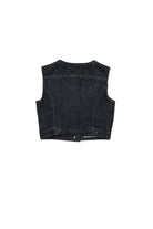 Black denim vest enriched with applied hotfixes that create plays of light and movement, making this garment perfect for adding a refined and original touch to any outfit.