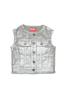 Denim vest with logo. This model stands out for its laminated effect and fringed hem.
