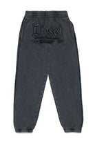Fleece jogger pants embellished with a Diesel For Successful Living graphic in gothic outline embroidery style. The worn-effect wash and raw-cut seams enhance the garment's grunge soul.