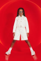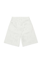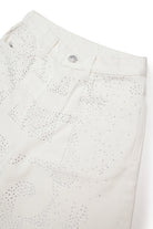 Denim shorts with rhinestone appliqués and perforated detailing forming the logo. A model with a distinctive style, perfect for casual looks.