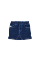 Denim skirt with applied logo and contrast stitching, featuring an elasticated waistband and five-pocket design.