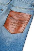 Slim jeans with light blue wash and oversized leather patch on the back pocket.