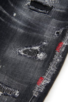 Regular jeans with a black used-effect wash, featuring rips and contrasting stitching details.