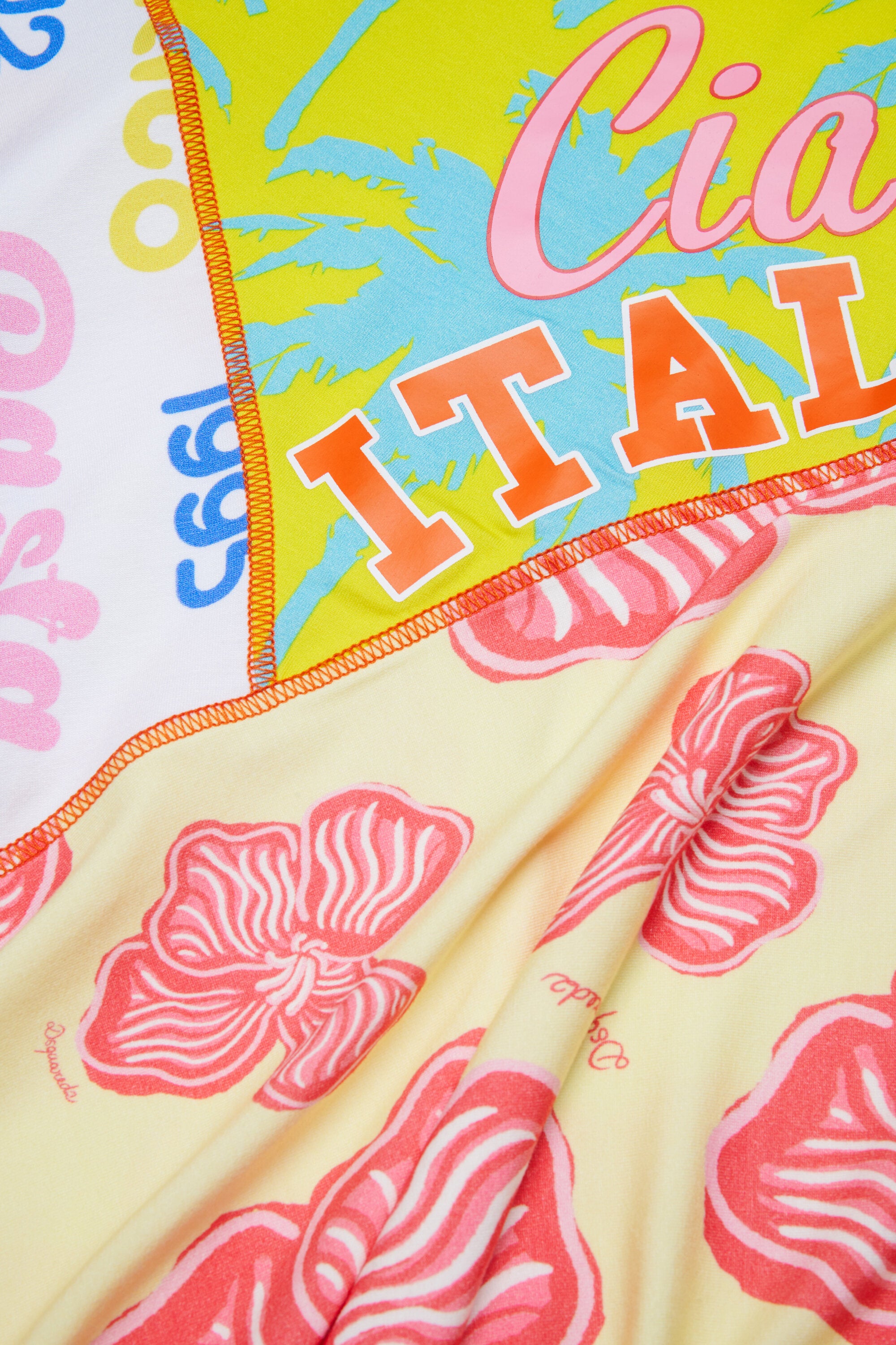 Mini dress with logo and multicolor patchwork, featuring a tropical print and floral patterns.