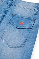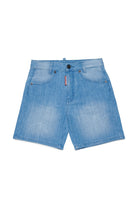 Light blue denim shorts with logo. A classic piece featuring patch pockets on the back.