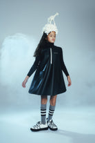 Short flared dress in Coated fabric with a strong contemporary character. Zip closure with contrasting color ribbon emphasizes the modern style. Front pockets add a functional touch. Perfect for special occasions.