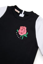 Mini dress with logo and embroidered rose on the chest, embellished with sequin appliqués and a ruffled hem.