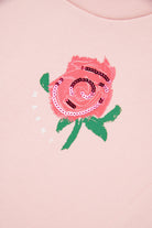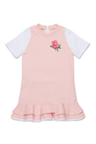 Mini dress with logo and embroidered rose on the chest, embellished with sequin appliqués and a ruffled hem.