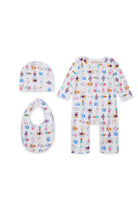 Soft microcostine knit birth set with matching bodysuit, cap and bib with allover Galaxy robot-themed graphics. The kit comes inside an original gift-box.