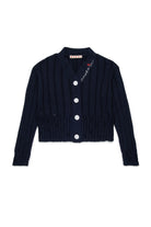 Long-sleeved ribbed knit cardigan with localised rips. Marni Flower logo in contrasting color on the collar. Front button closure. Made of 100% cotton.
