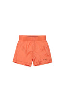 Boxer swimsuit with logo, featuring a patch back pocket and contrast stitching.