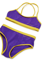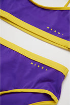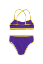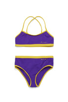 Lycra bikini swimming costume with crossed shoulder straps. Customised with institutional logo and contrasting color hem.