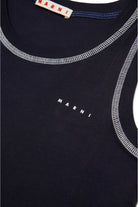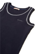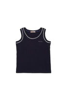 Sleeveless jersey T-shirt. Institutional logo on the front on the heart side. Overlock seams in color contrast stitching. Made of 100% cotton.