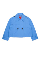 Cropped double-breasted jacket with embroidered logo on the cuff. The design features structured shoulders, buttons on the shoulders, and a front closure.