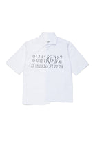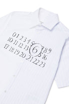 Short-sleeved shirt with printed logo and front numerical motif. The style features a bicolor design with one half in fine stripes and the other in a solid color.