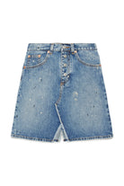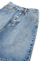 Jeans mini skirt. Blue denim with contrasting color gradients. Characterised by the 'color spots' treatment carried out by hand. Raw-cut hems. Exposed button closure. Iconic seam at back. Made of 100% cotton. Any differences between the photographed garment and the one you will receive are a symbol of the fine workmanship, quality and uniqueness of the product.