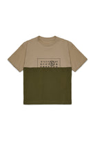 Short-sleeved T-shirt in soft two-tone cotton jersey, featuring a re-cut construction that simulates the assembly of two deconstructed and reassembled garments. A garment that embodies MM6's signature DNA.